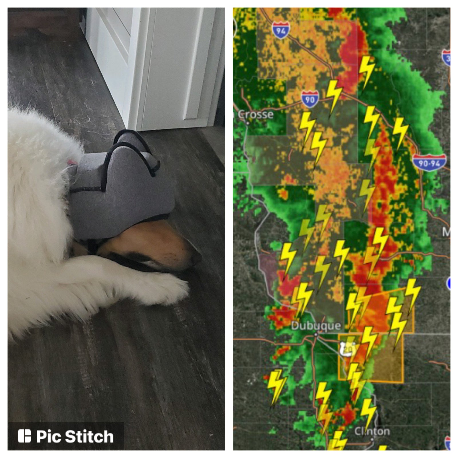 "Bella's first storm, So happy she is snoozing!"